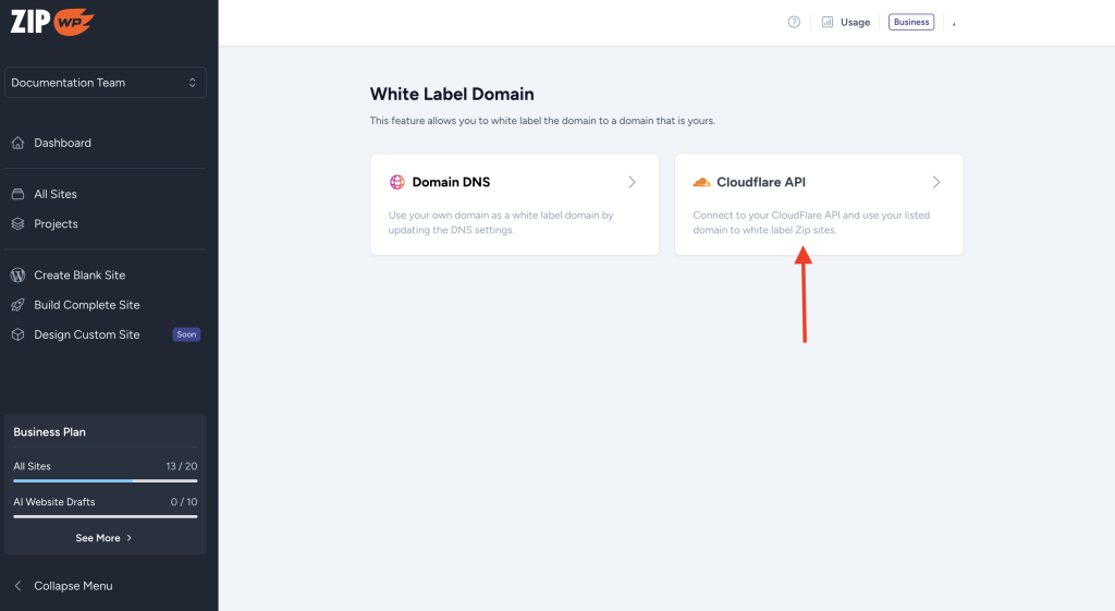 But now, that has changed. We’ve introduced a very simple way to white-label the domain of your ZipWP organization if you have your domain registered with Cloudflare.